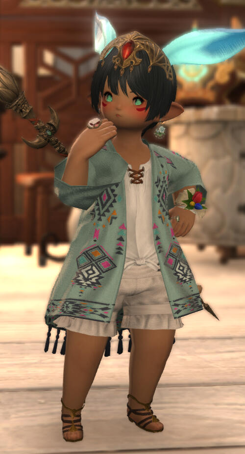 Born in Ul'dah, Chachamu had been used to picking up odd work since very young. Her mother, a conjurer chirugeon, made just barely enough gil to support the both of them. During the long hours her mother was away, Chachamu was constantly working selling flowers or doodles to any travelers and merchants on the Sapphire Avenue Exchange that would give her their time. With the little gil she'd gained, she'd often buy gifts for her mother after a long night at the clinic. As she grew a bit older, merchants at the exchange would end up hiring her for any small work they needed, be it gathering herbs, delivering receipts and orders, or eventually even travelling with them around Thanalan to help load carriages and be a conversation partner.She also learned conjury from her mother from a young age. She'd use her talents to help the merchants of Thanalan and eventually joining the Adventurer's Guild at 15 years old. After a few years of taking on leves with members of the guild, helping her mother at the clinic, and continuing to take on odd jobs, she would travel to Gridania to both further her knowledge of conjury and learn other trades.